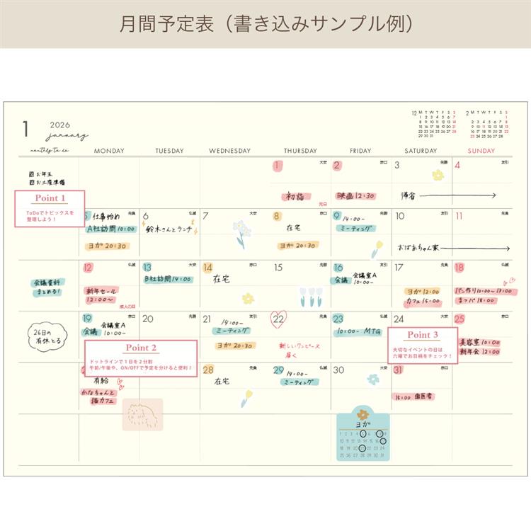 - (品番)2601KFR-PK、(始まり月)2026年1月~2027年3月、(始まり曜日)月曜始まり、(レイアウト)週間ウィークリー、(サイズ)B6サイズ、(内容)2026・2027年間カレンダー/イヤースケジュール/ハビットトラッカー/東京・大阪近郊路線図/主要都市地下鉄路線図/ノート/ネクストイヤープラン、(本文)192ページ