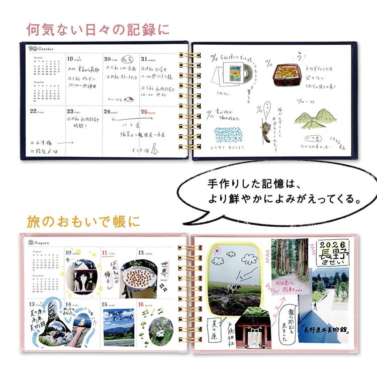 - (品番)2612R01-CR、(始まり月)2025年12月~2027年1月、(始まり曜日)月曜始まり、(レイアウト)週間ウィークリー、(サイズ)A6サイズ、(内容)2026・2027年間カレンダー/年間予定表/無地ページ/ポケット、(本文)176ページ