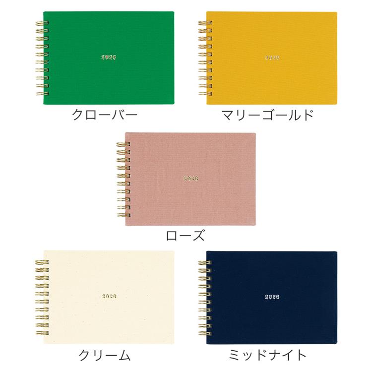 - (品番)2612R01-MN、(始まり月)2025年12月~2027年1月、(始まり曜日)月曜始まり、(レイアウト)週間ウィークリー、(サイズ)A6サイズ、(内容)2026・2027年間カレンダー/年間予定表/無地ページ/ポケット、(本文)176ページ