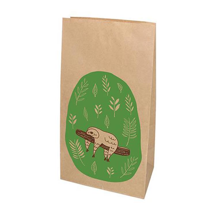 たくさんの葉っぱに囲まれ、木の上で眠るナマケモノが描かれた可愛らしい角底袋です。