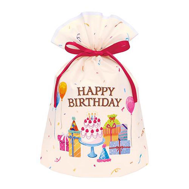 誕生日ケーキやプレゼントボックスを描いた、楽しげな雰囲気のバースデーギフトバッグです。