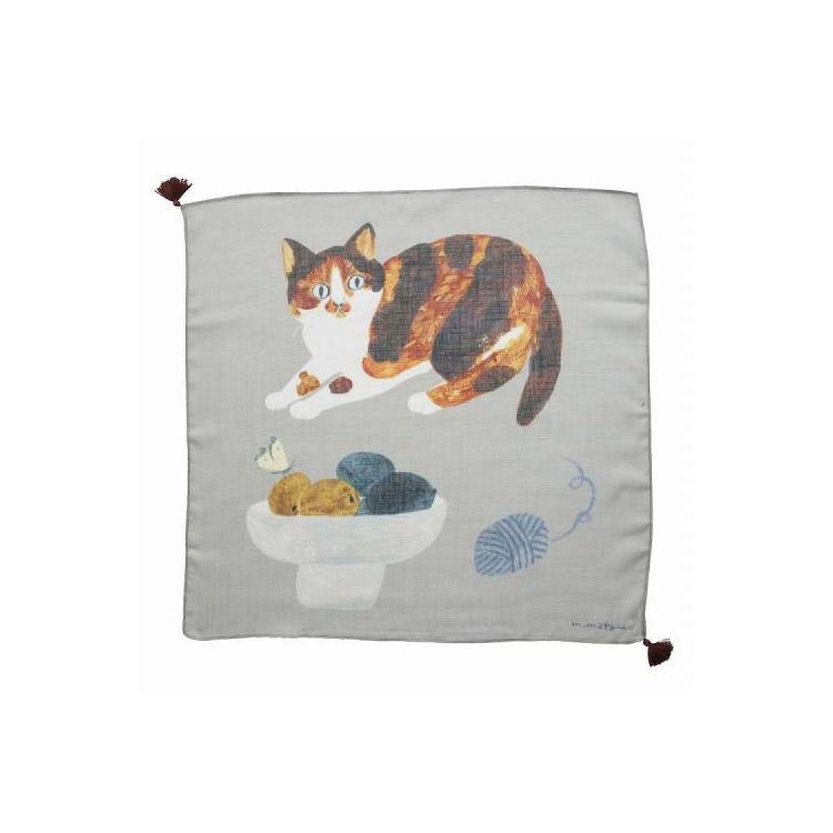 ふわっと柔らかな大きめサイズのタッセル付きクロスです。松尾ミユキさんが描く、暮らしの中のねこたちや植物の、静かで穏やかなワンシーンを切り取ったデザイン。肩にかけたり、インテリアとして取り入れたり。