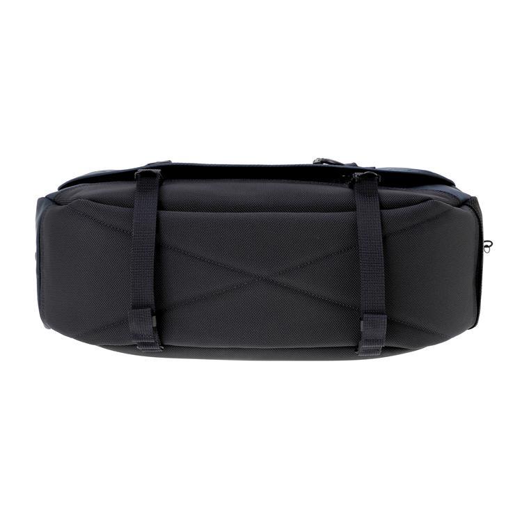 メッセンジャーバッグは大容量のメイン収納部と、内装に16inchのPCを収納できるクッション材入りのポケットを設けています。サイドポケットには600mlのペットボトルや折り畳み傘を収納することができます。背面側の上部にファスナーを設けることで内装に直接アクセスできる仕様で、フラップを開けなくてもPCや荷物を取り出すことが可能です。また、収納部の口元部分を金具で留めることができる仕様のため、型崩れしにくいのもポイントです。