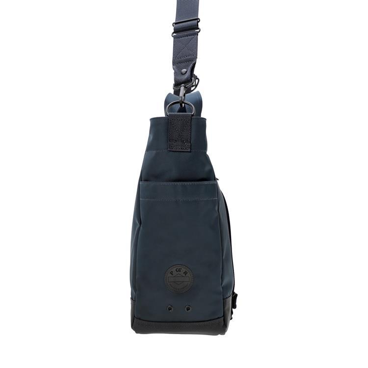 メイン素材にナイロンツイル生地を使用しており、PVC加工を施すことで耐水性を高めています。負荷のかかりやすい底マチ部分にはコーデュラバリスティックナイロンを採用し、耐久性も上げました。本体の前面や底面に身の回りのものを簡易的に固定して持ち運ぶことができるスリングバインダーも配しています。バックパックやウエストバッグはテープをクロスさせることで、見た目のアクセントにしました。ショルダーストラップはワンアクションで滑らかな調節が可能な画期的な仕様です。