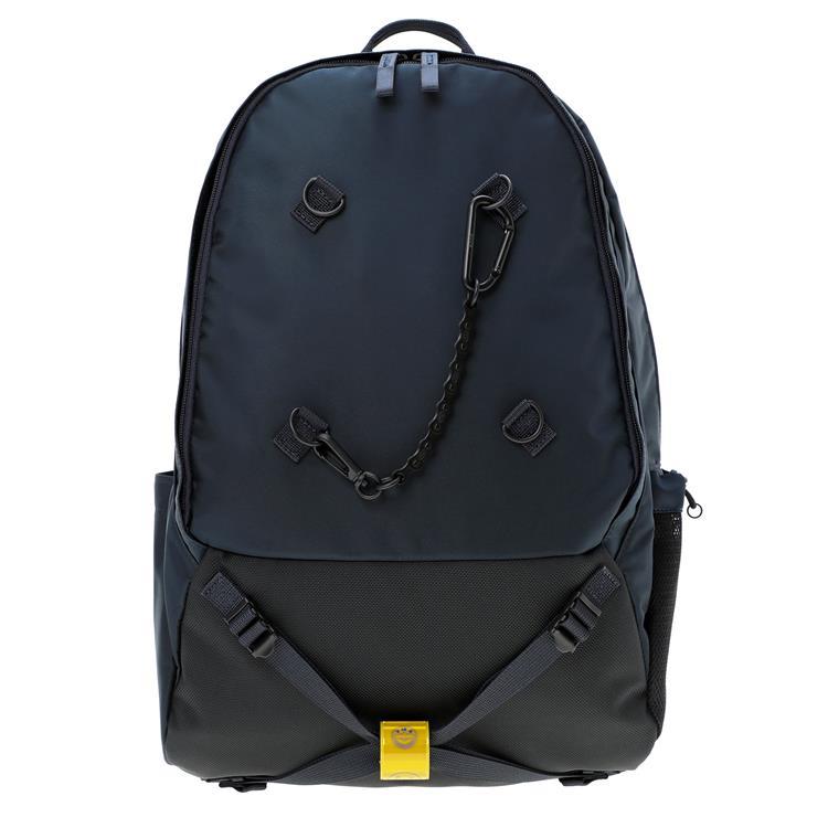 デイパックは3層構造の収納部を設けたオン・オフ問わず使える機能的なアイテムです。メイン収納部はファスナーによって大きく開くため、中の荷物が見やすい仕様です。後層部分の内装にクッション材を配しており、16inchのPCを収納可能です。前層部分は内装にスマートフォンやウォレットなどを収納できるポケットを設けています。サイドポケットには600mlのペットボトルや折り畳み傘が収納可能です。