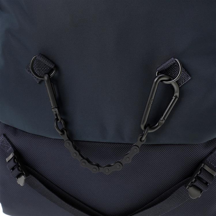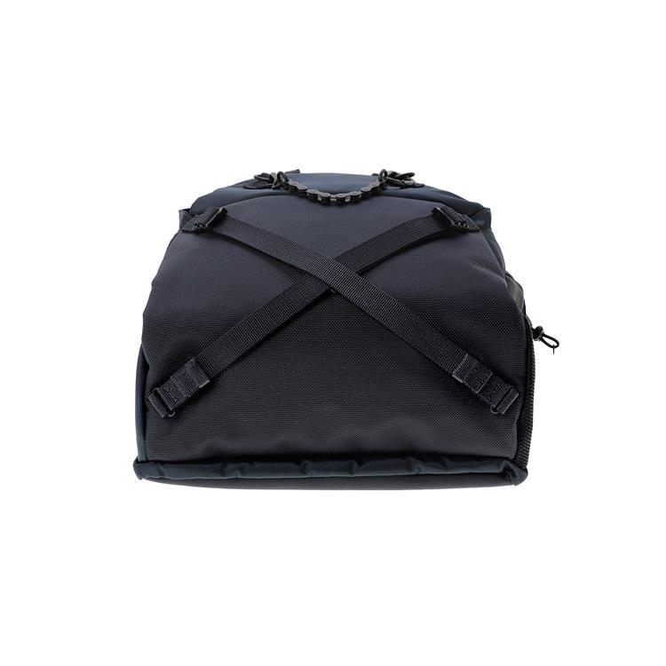 メイン素材にナイロンツイル生地を使用しており、PVC加工を施すことで耐水性を高めています。負荷のかかりやすい底マチ部分にはコーデュラバリスティックナイロンを採用し、耐久性も上げました。本体の前面や底面に身の回りのものを簡易的に固定して持ち運ぶことができるスリングバインダーも配しています。バックパックやウエストバッグはテープをクロスさせることで、見た目のアクセントにしました。ショルダーストラップはワンアクションで滑らかな調節が可能な画期的な仕様です。