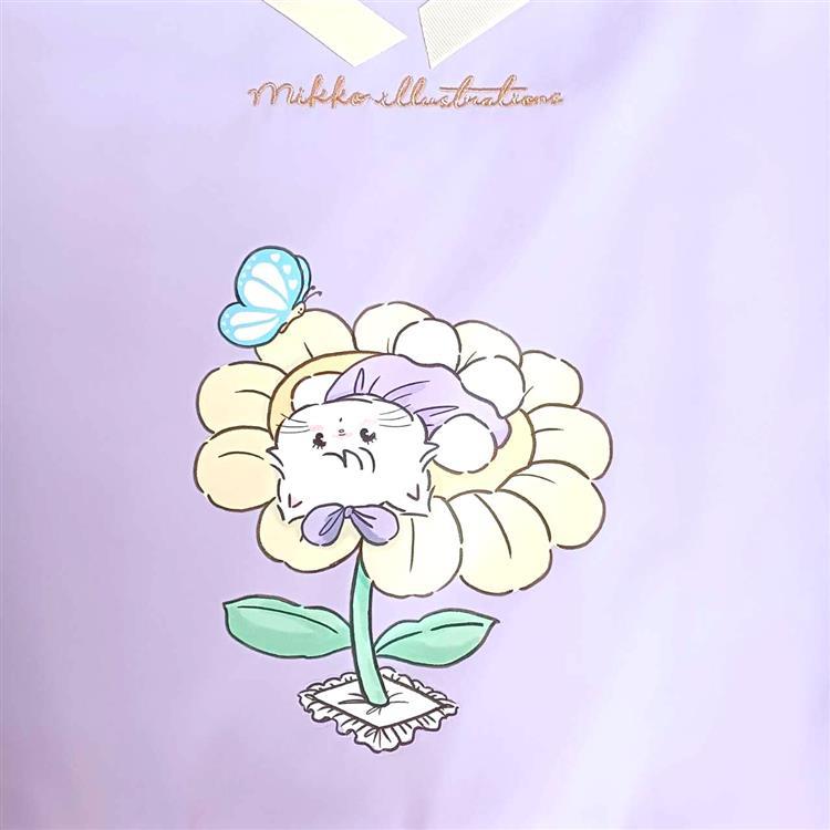 子ねこの『ムース』がお花の上に寝ころんでいるイラストがかわいいデザインです。