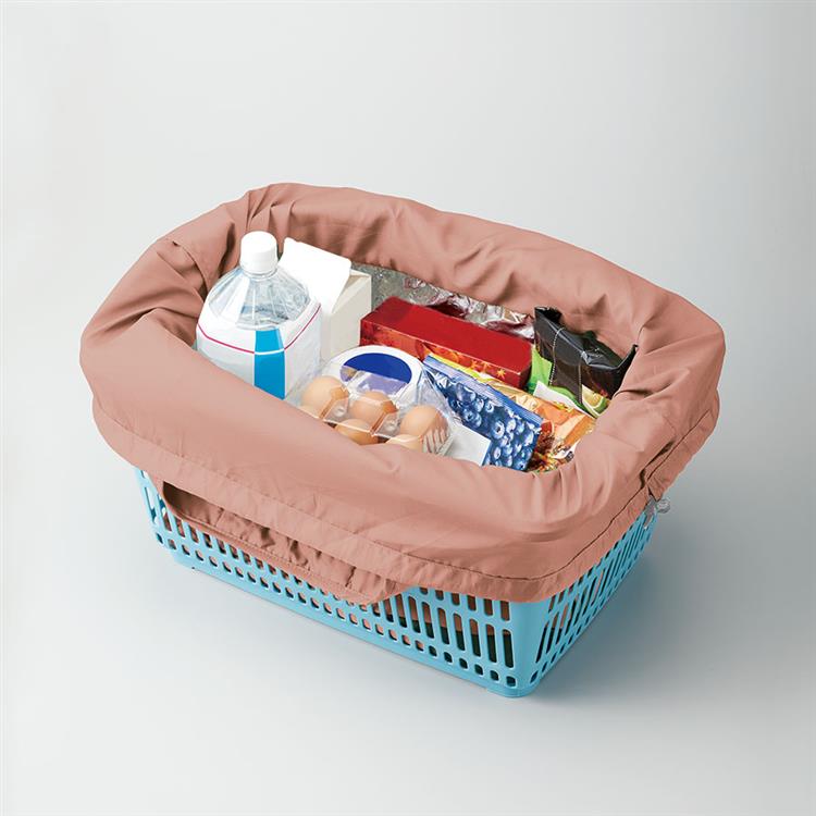 内側のアルミがしっかりしているので自立させることができ、2Lペットボトルや牛乳パックが固定できるゴムバンドが付いたマルシェバッグ。