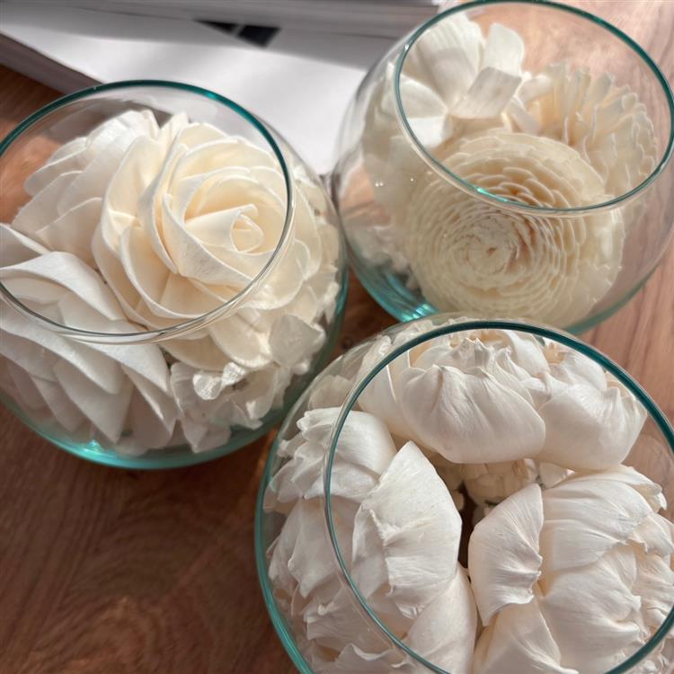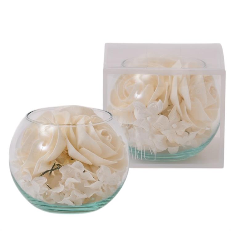 シンプルなグラスにソラフラワーとサー・ペーパーをあしらった、香り付きポプリです。