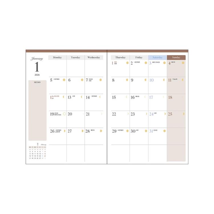 日々の予定をたくさん書き込める幅広マンスリーは月の満ち欠けや縁起のいい日が分かるようになっています。