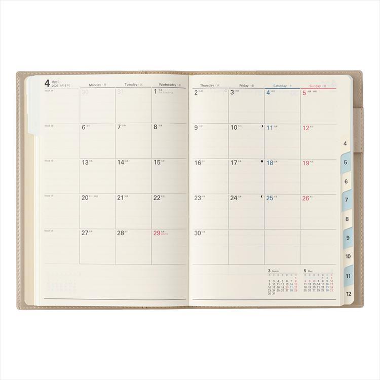 【月間ページ】見開き1ヶ月のベーシックなブロックタイプ(月曜始まり)。カレンダーと同じような感覚で見ることができ、週ごとの予定が把握しやすいのが特徴です。