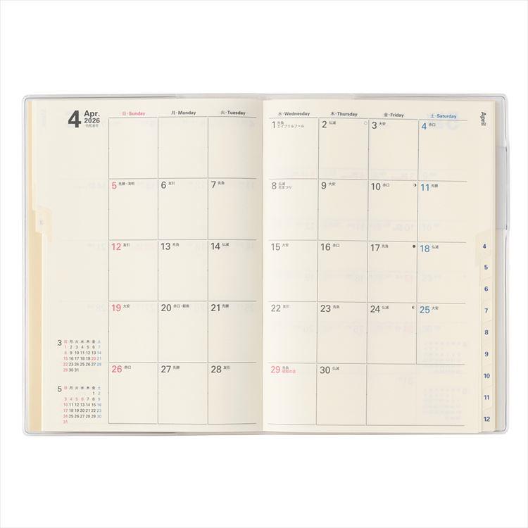 【月間ページ】広々書ける人気のB6サイズ(日曜始まり)。薄くて軽いので、カバンに入れて持ち運ぶのにもとっても便利。