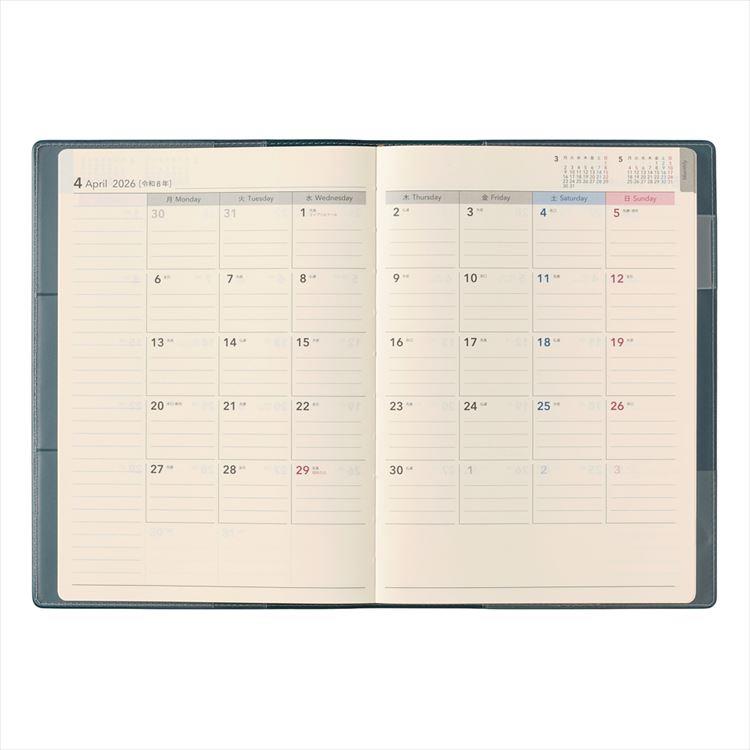 【月間ページ】見開き1ヶ月のベーシックなブロックタイプ(月曜始まり)。カレンダーと同じような感覚で見ることができ、週ごとの予定が把握しやすいのが特徴です。