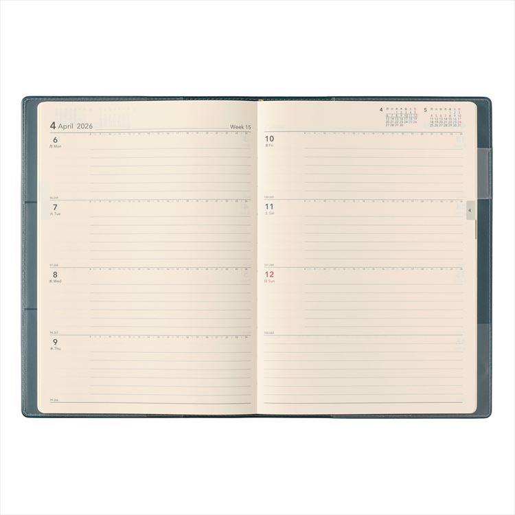 【週間ページ】見開き1週間で、左右のページに日付が分割されているメモタイプのレイアウト(月曜始まり)。1日分のスペースが広いので、日記などの記録に便利です。