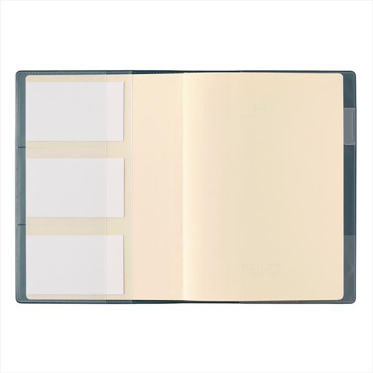 カバー前側には3段名刺ポケット、カバー後ろ側には名刺ポケット・ペンホルダーが付いています。