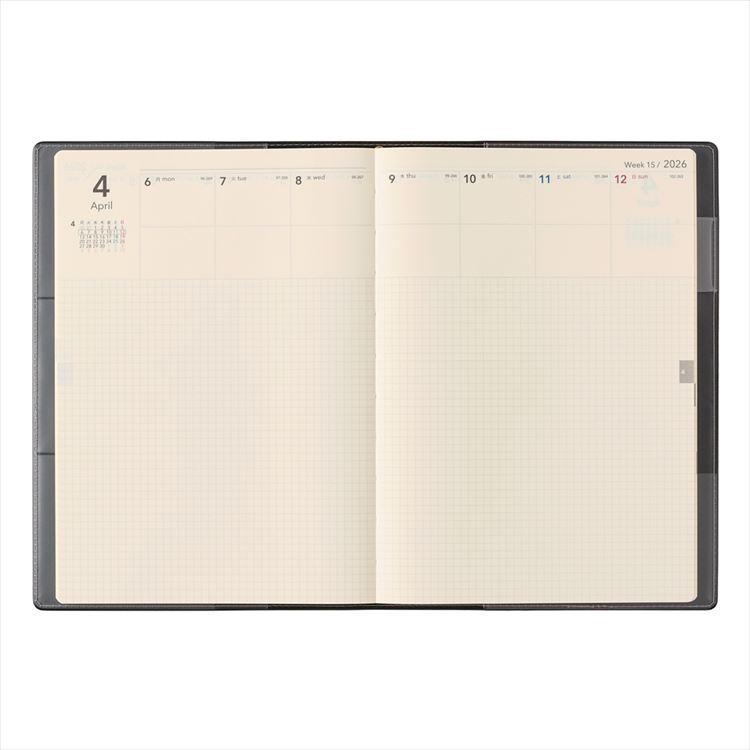【週間ページ】上部のスケジュール欄(月曜始まり)で予定を把握しながら、たっぷりの方眼メモスペースはノートのように使えます。手帳とノートを一元管理したい方や自由にカスタマイズしたい方におすすめです。
