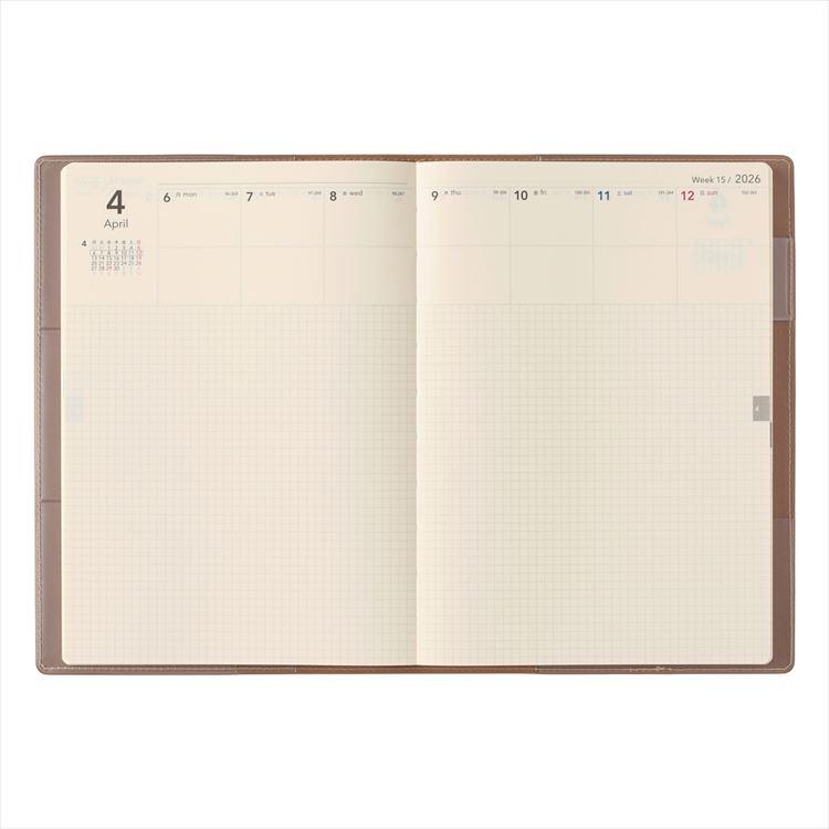 【週間ページ】上部のスケジュール欄(月曜始まり)で予定を把握しながら、たっぷりの方眼メモスペースはノートのように使えます。手帳とノートを一元管理したい方や自由にカスタマイズしたい方におすすめです。