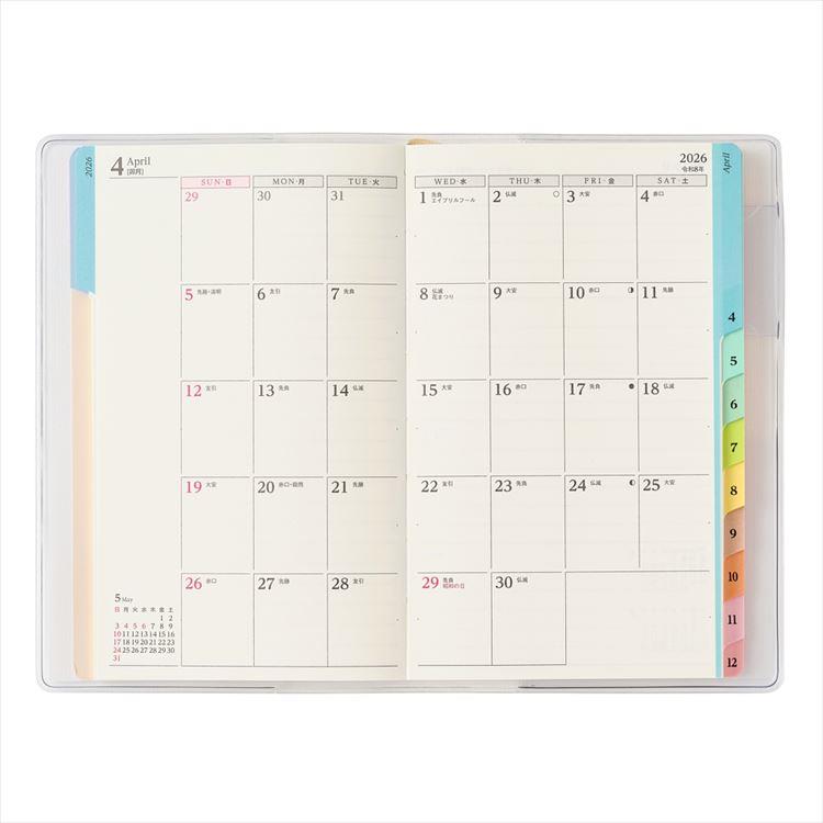 【月間ページ】見たいページがパッと開けるインデックス付き(日曜始まり)。