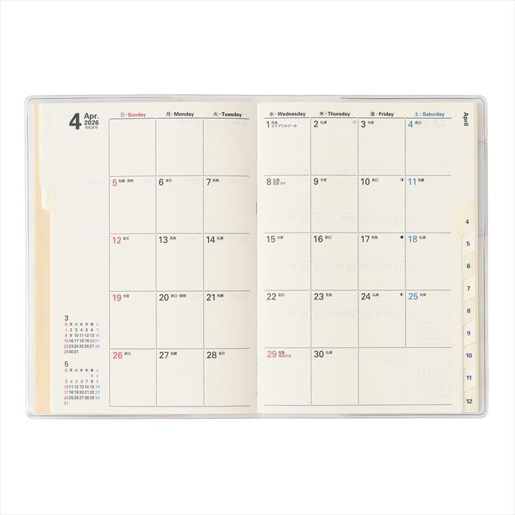 【月間ページ】見開き1ヵ月のベーシックなブロックタイプ(日曜始まり)。カレンダー感覚で月ごとの予定が把握しやすく、見たいページをパッと開けるインデックス付きです。