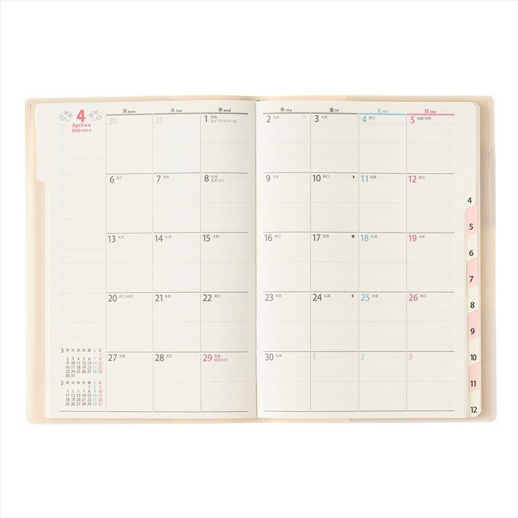 【月間ページ】見開き1ヵ月のブロックタイプ(月曜始まり)。カレンダー感覚で月ごとの予定が把握しやすく、見たいページをパッと開けるインデックス付き。