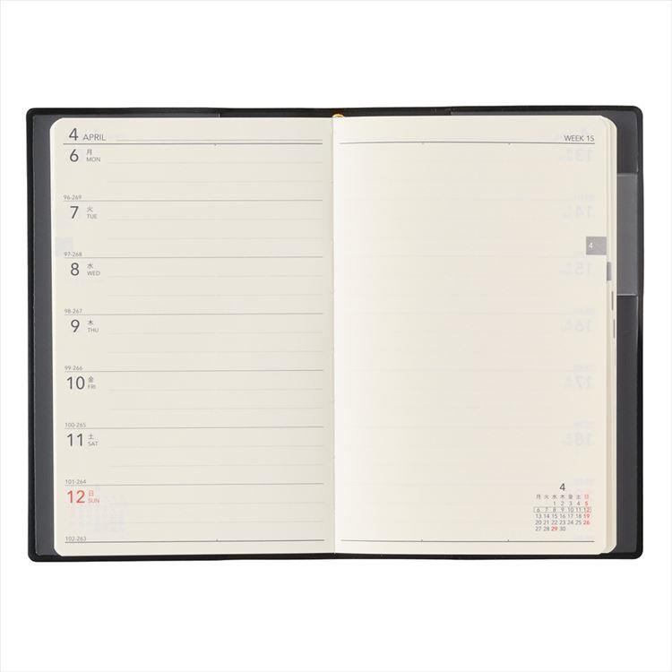 【週間ページ】見開き1週間で左ページに予定、右ページはメモスペースとして使えるレフトタイプ(月曜始まり)。予定とメモにバランスの良い手帳です。