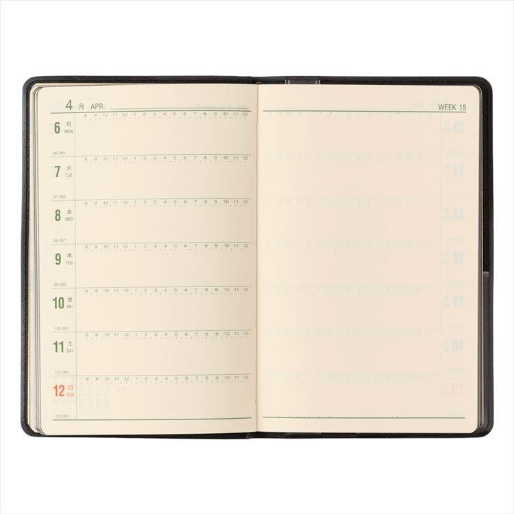 【週間ページ】見開き1週間で左ページに予定、右ページはメモスペースとして使えるレフトタイプ(月曜始まり)。予定とメモにバランスの良い手帳です。
