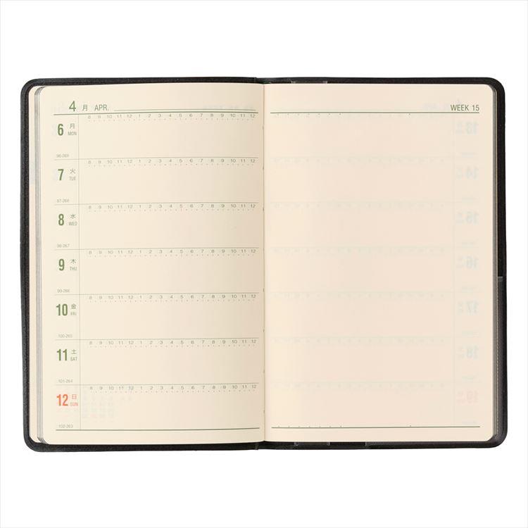 【週間ページ】見開き1週間で左ページに予定、右ページはメモスペースとして使えるレフトタイプ(月曜始まり)。予定とメモにバランスの良い手帳です。