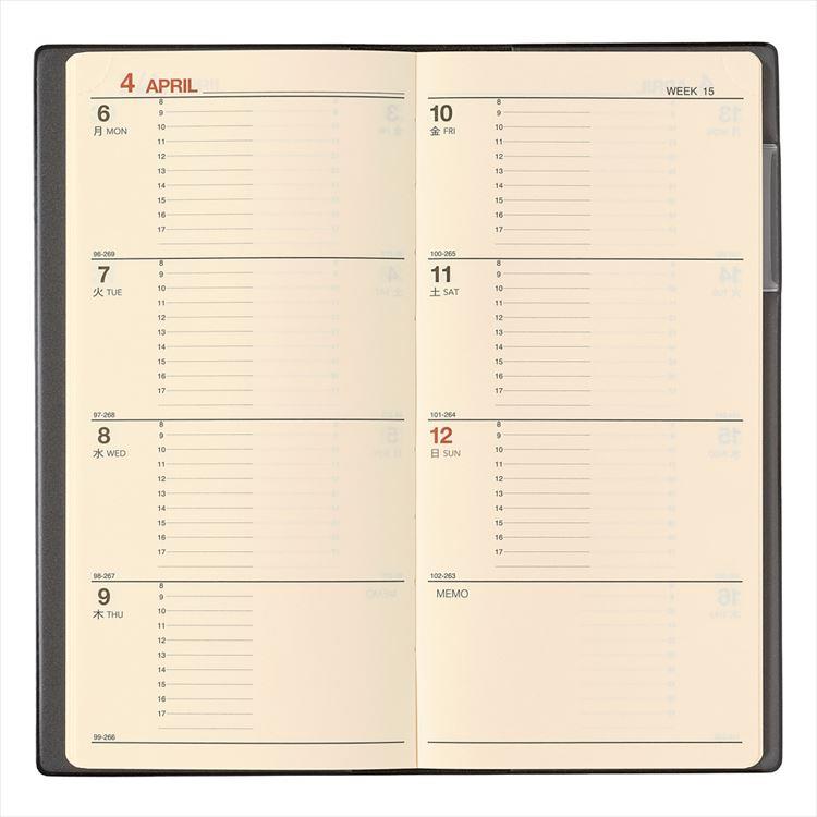 【週間ページ】見開き1週間の時間目盛り付きメモタイプ(月曜始まり)。1日分のスペースが広いので、日記などの記録に便利です。