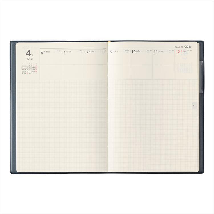 【週間ページ】上部のスケジュール欄(月曜始まり)で予定を把握しながら、たっぷりの方眼メモスペースはノートのように使えます。手帳とノートを一元管理したい方や自由にカスタマイズしたい方におすすめです。