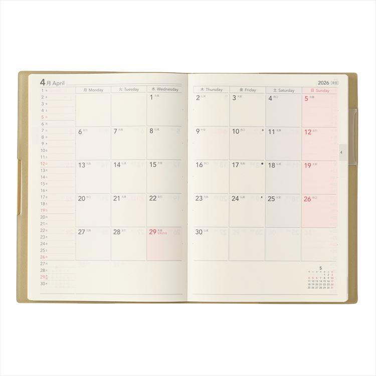 【月間ページ】見開き1ヶ月のベーシックなブロックタイプ(月曜始まり)。カレンダーと同じような感覚で見ることができ、週ごとの予定が把握しやすいのが特徴です。