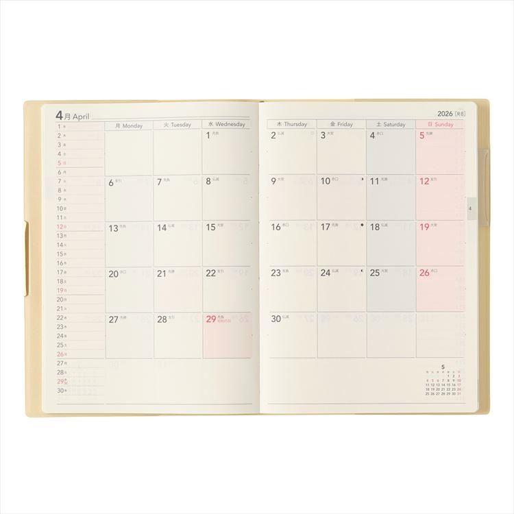 【月間ページ】見開き1ヶ月のベーシックなブロックタイプ(月曜始まり)。カレンダーと同じような感覚で見ることができ、週ごとの予定が把握しやすいのが特徴です。