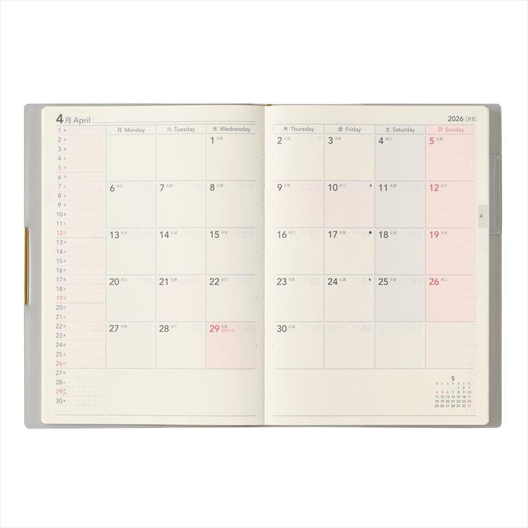 【月間ページ】見開き1ヶ月のベーシックなブロックタイプ(月曜始まり)。カレンダーと同じような感覚で見ることができ、週ごとの予定が把握しやすいのが特徴です。