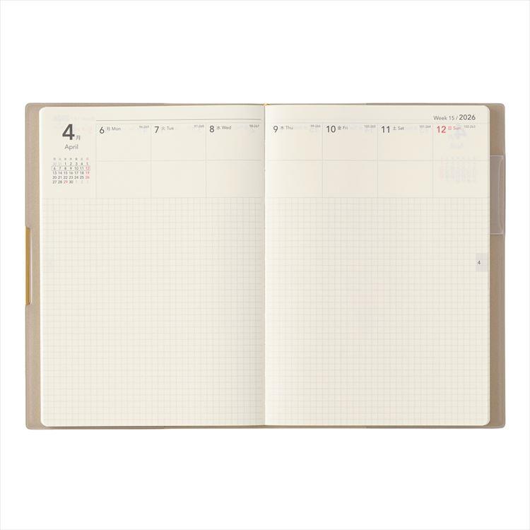 【週間ページ】上部のスケジュール欄(月曜始まり)で予定を把握しながら、たっぷりの方眼メモスペースはノートのように使えます。手帳とノートを一元管理したい方や自由にカスタマイズしたい方におすすめです。