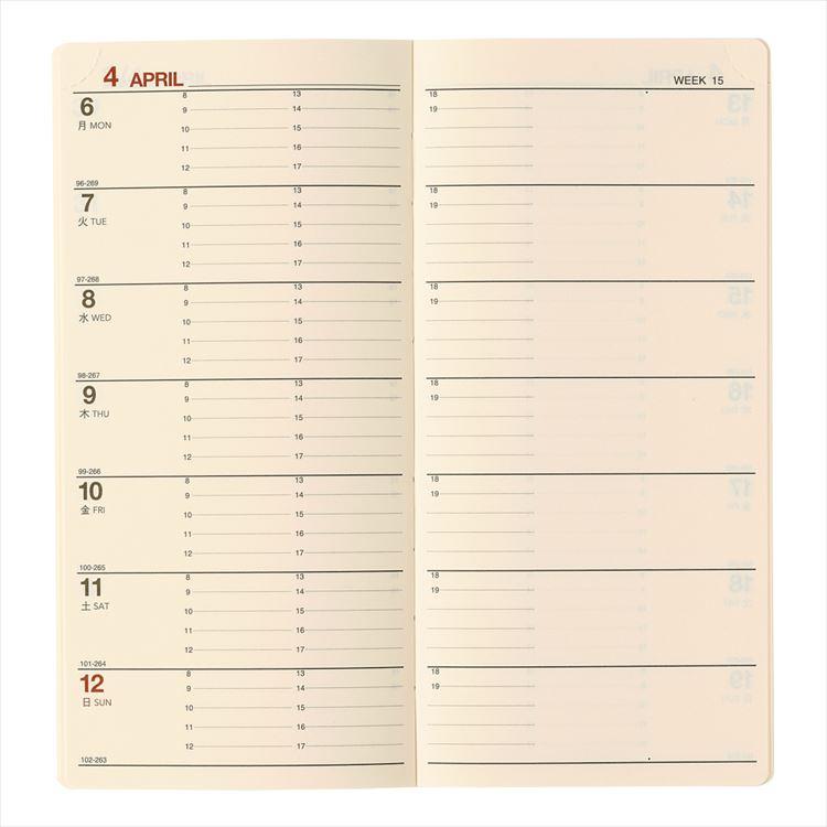 【週間ページ】左ページに時間軸が入ったゾーンタイプ。時間管理とメモの併用に便利なレイアウトです。