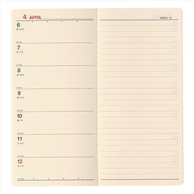 【週間ページ】見開き1週間のレフトタイプ(月曜始まり)。予定とメモにバランスよく使えるので、初心者にもおすすめのレイアウトです。
