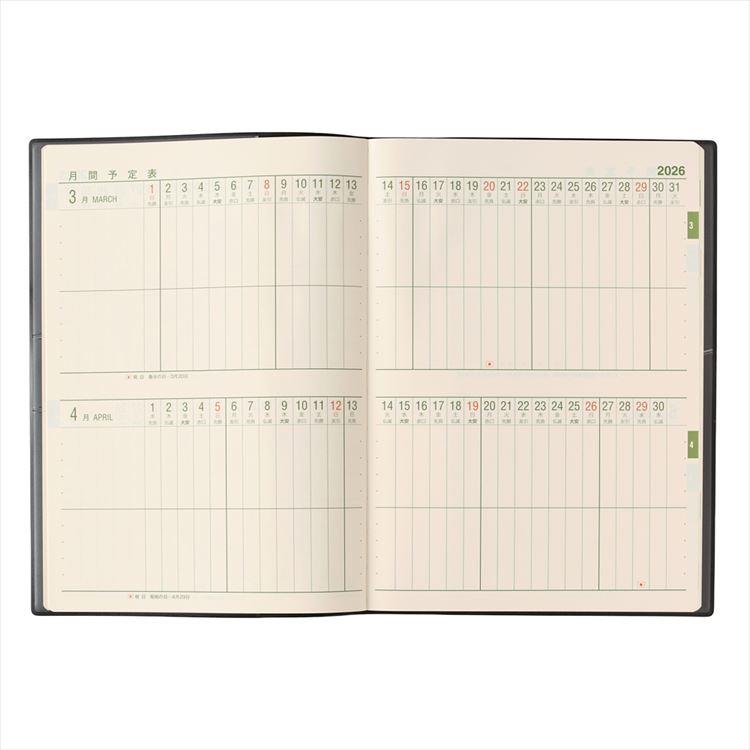 【月間ページ】見開き2ヶ月で日付が横に並ぶガントチャートタイプのレイアウト。長期の予定やプロジェクト管理に便利です。