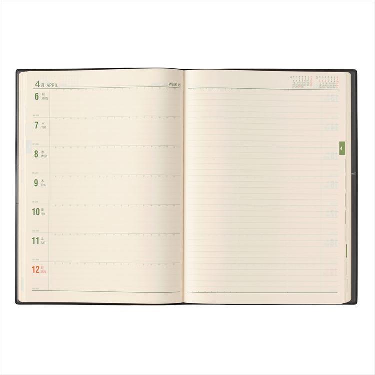 【週間ページ】見開き1週間で左ページに予定、右ページはメモスペースとして使えるレフトタイプ(月曜始まり)。予定とメモにバランスの良い手帳です。