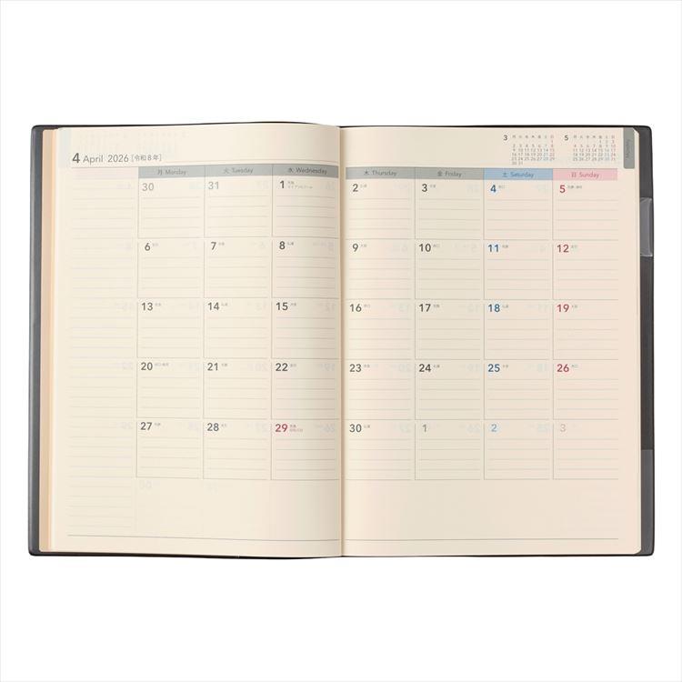 【月間ページ】見開き1ヶ月のベーシックなブロックタイプ(月曜始まり)。カレンダーと同じような感覚で見ることができ、週ごとの予定が把握しやすいのが特徴です。