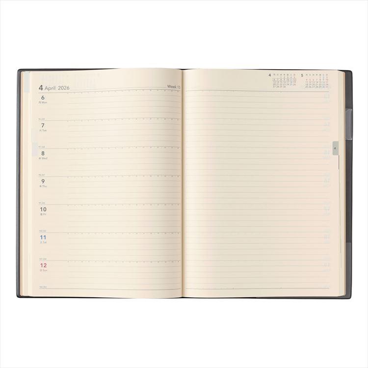 【週間ページ】見開き1週間のレフトタイプ(月曜始まり)。予定とメモにバランスの良い手帳です。
