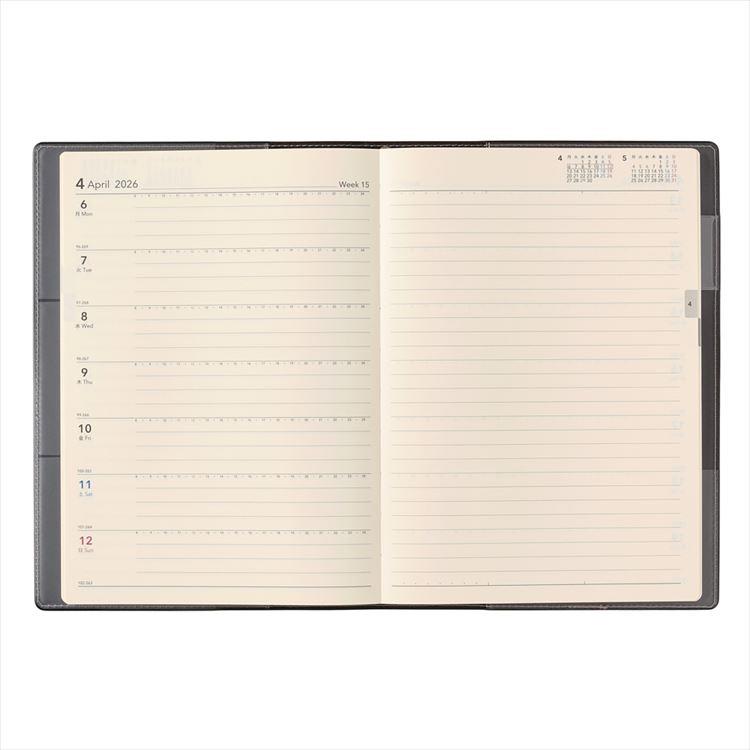 【週間ページ】見開き1週間で左ページに予定、右ページはメモスペースとして使えるレフトタイプ(月曜始まり)。予定とメモにバランスの良い手帳です。