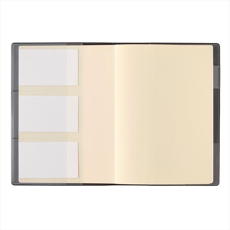 カバー前側には3段名刺ポケット、カバー後ろ側には名刺ポケット・ペンホルダーが付いています。