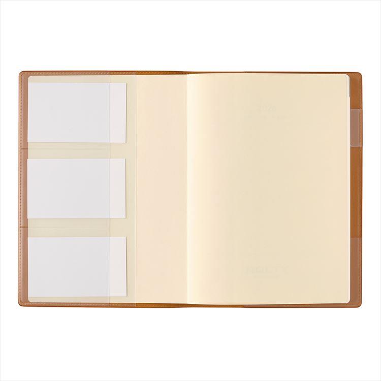 カバー前側には3段名刺ポケット、カバー後ろ側には名刺ポケット・ペンホルダーが付いています。