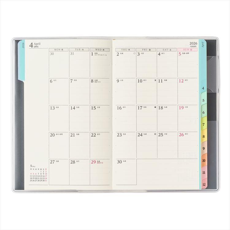 【月間ページ】見たいページがパッと開けるインデックス付き(月曜始まり)。