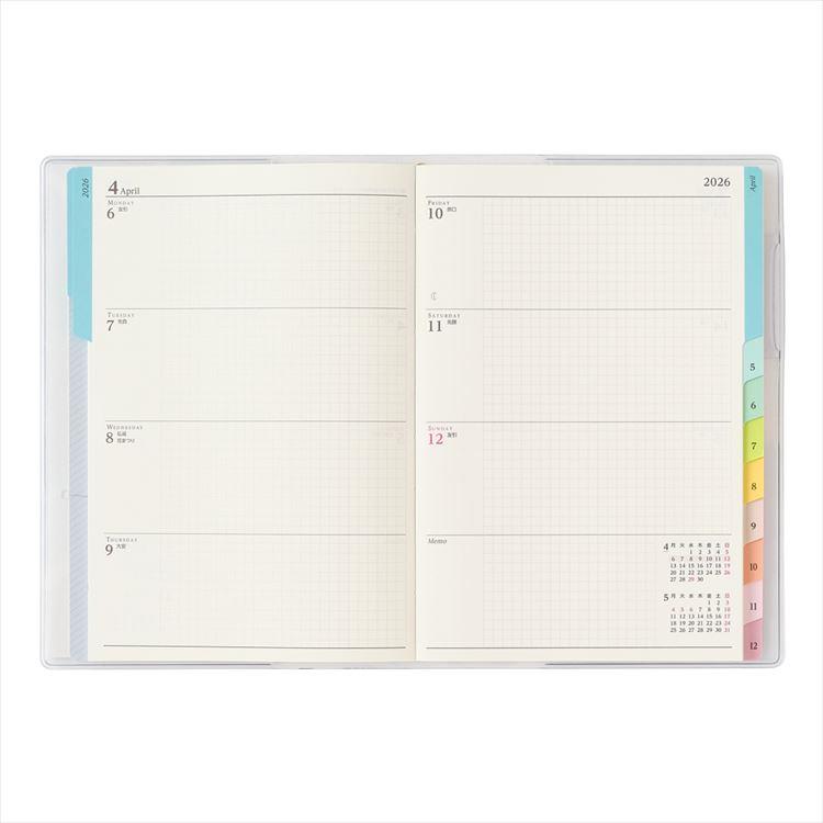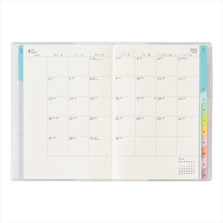 【月間ページ】見開き1ヶ月のブロックタイプ(月曜始まり)。見たいページがパッと開けるインデックス付き。