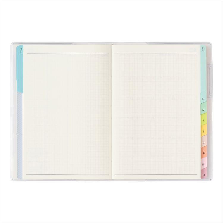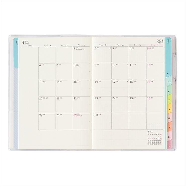 【月間ページ】見開き1ヶ月のブロックタイプ(月曜始まり)。見たいページがパッと開けるインデックス付き。