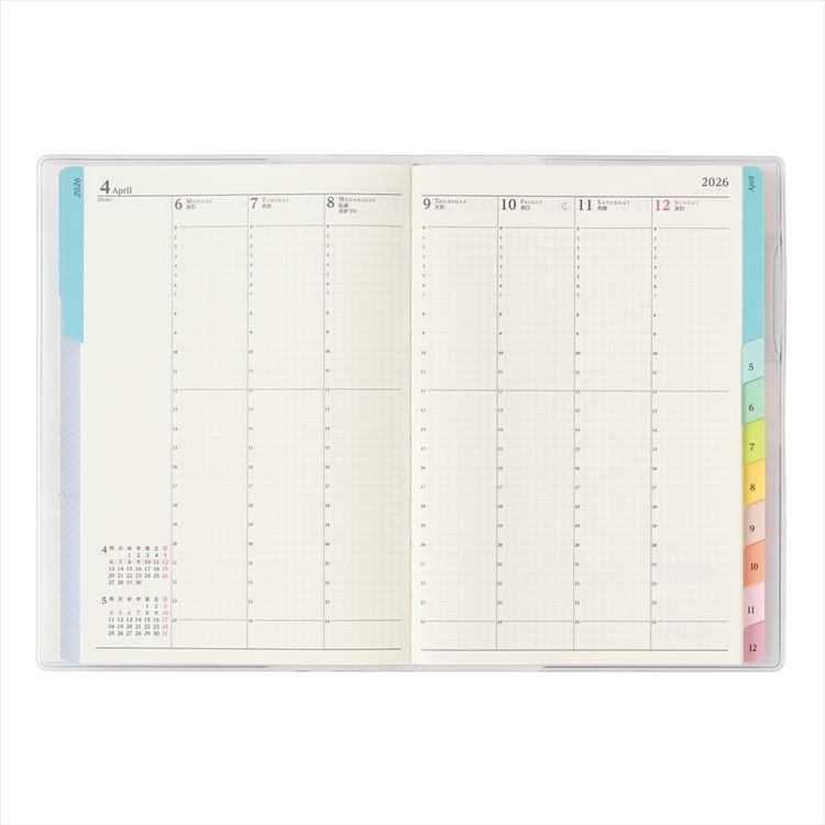 【週間ページ】見開き1週間で時間軸が入った土日均等のバーチカルタイプ。1日に複数の予定が入る人におすすめです