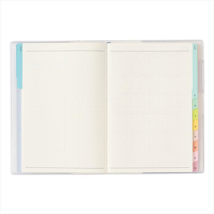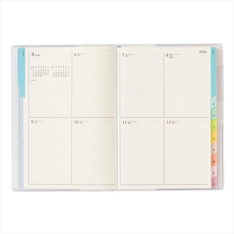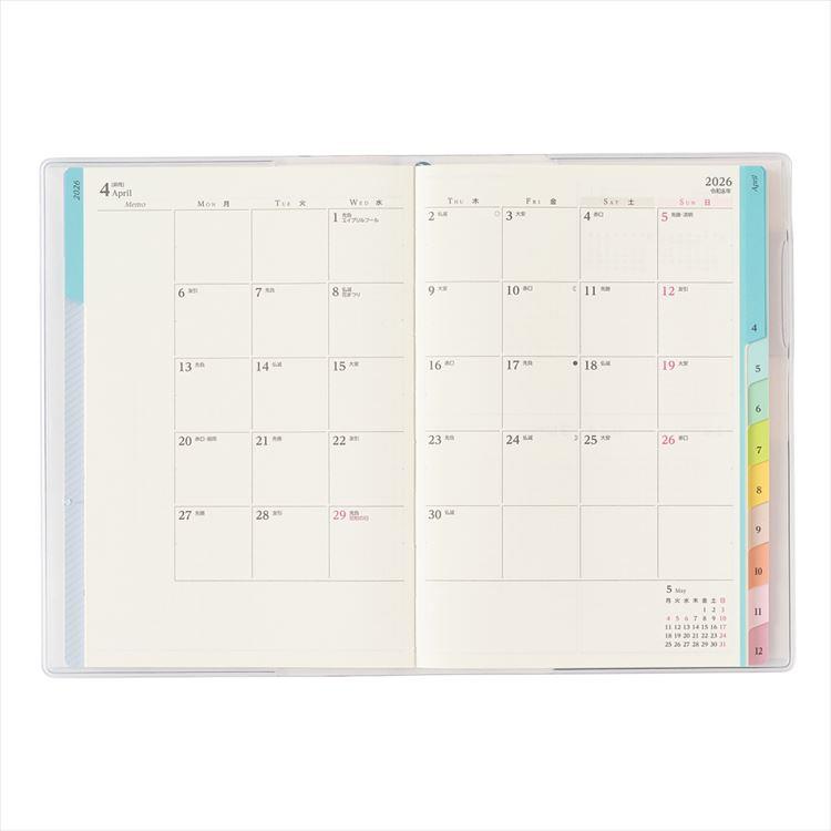 【月間ページ】見開き1ヶ月のブロックタイプ(月曜始まり)。見たいページがパッと開けるインデックス付き。