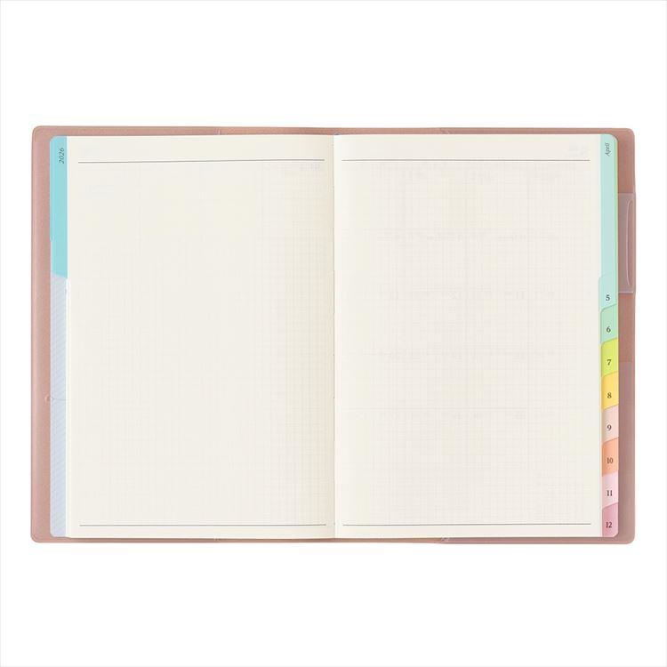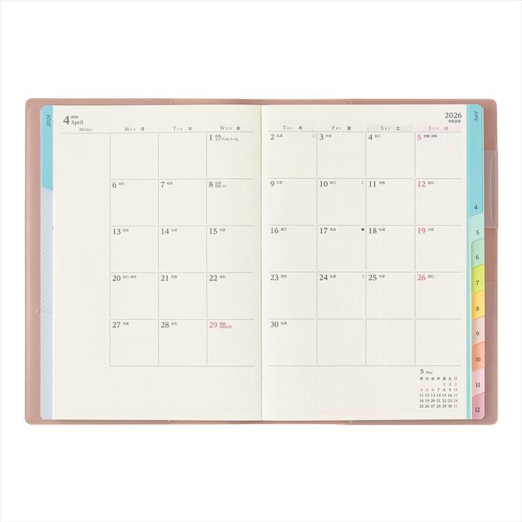 【月間ページ】見開き1ヶ月のブロックタイプ(月曜始まり)。見たいページがパッと開けるインデックス付き。