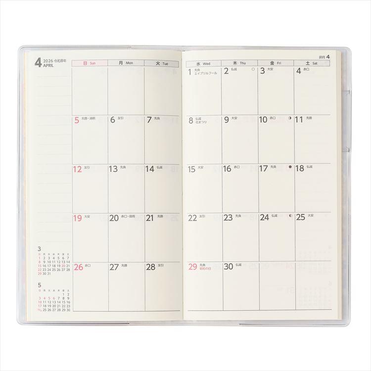 【月間ページ】見開き1ヵ月のベーシックなブロックタイプ(日曜始まり)。カレンダーと同じような感覚で見ることができ、月ごとの予定が把握しやすいのが特長です。