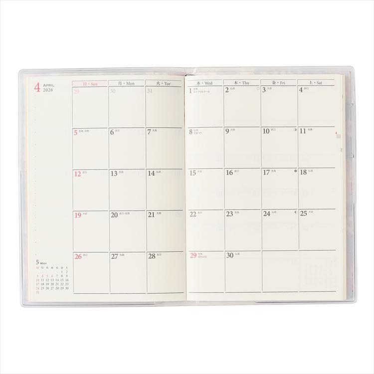 【月間ページ】見開き1ヵ月のベーシックなブロックタイプ(日曜始まり)。カレンダーと同じような感覚で見ることができ、月ごとの予定が把握しやすいのが特長です。
